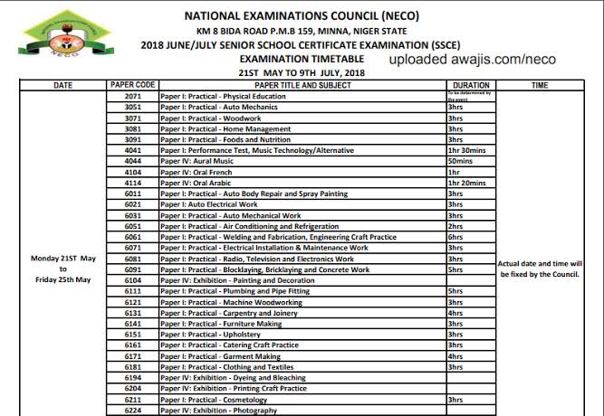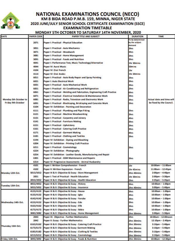 Neco Time Table For 2020 Session